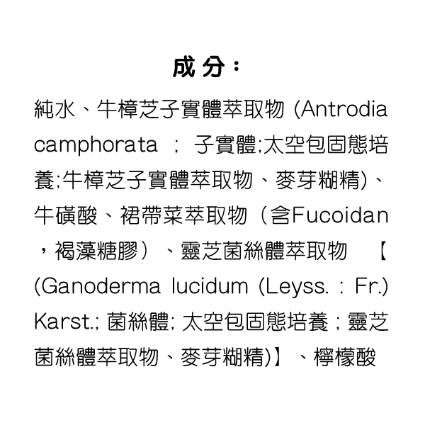 純水、牛樟芝子實體萃取物 (Antrodia camphorata、子實體、太空包固態培養、 牛樟芝子實體萃取物、麥芽糊精)、牛磺酸、裙帶菜萃取物(Fucoidan、褐藻糖膠)、 靈芝菌絲體萃取物【( Ganoderma lucidum ( Leyss. : Fr.) Karst.、菌絲體、 太空包固態培養、靈芝菌絲體萃取物、麥芽糊精 )】、檸檬酸