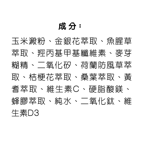 玉米澱粉、金銀花萃取、魚腥草萃取、羥丙基甲基纖維素、麥芽糊精、二氧化矽、荷蘭防風草萃取、 桔梗花萃取、桑葉萃取、黃耆萃取、維生素C、硬脂酸鎂、 蜂膠萃取、純水、二氧化鈦、維生素D3